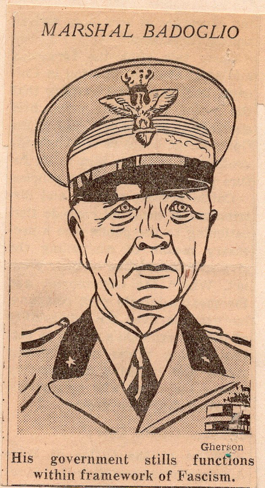 MARSHAL BADOGLIO. Gherson. His government stills functions within framework of Fascism.