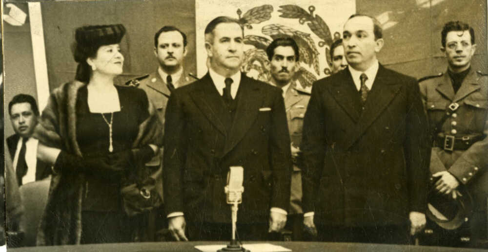 El presidente Manuel Ávila Camacho, su esposa Soledad Orozco y Rafael Pascacio Gamboa director general del Sistema Nacional de Pensiones en una ceremonia cívica.