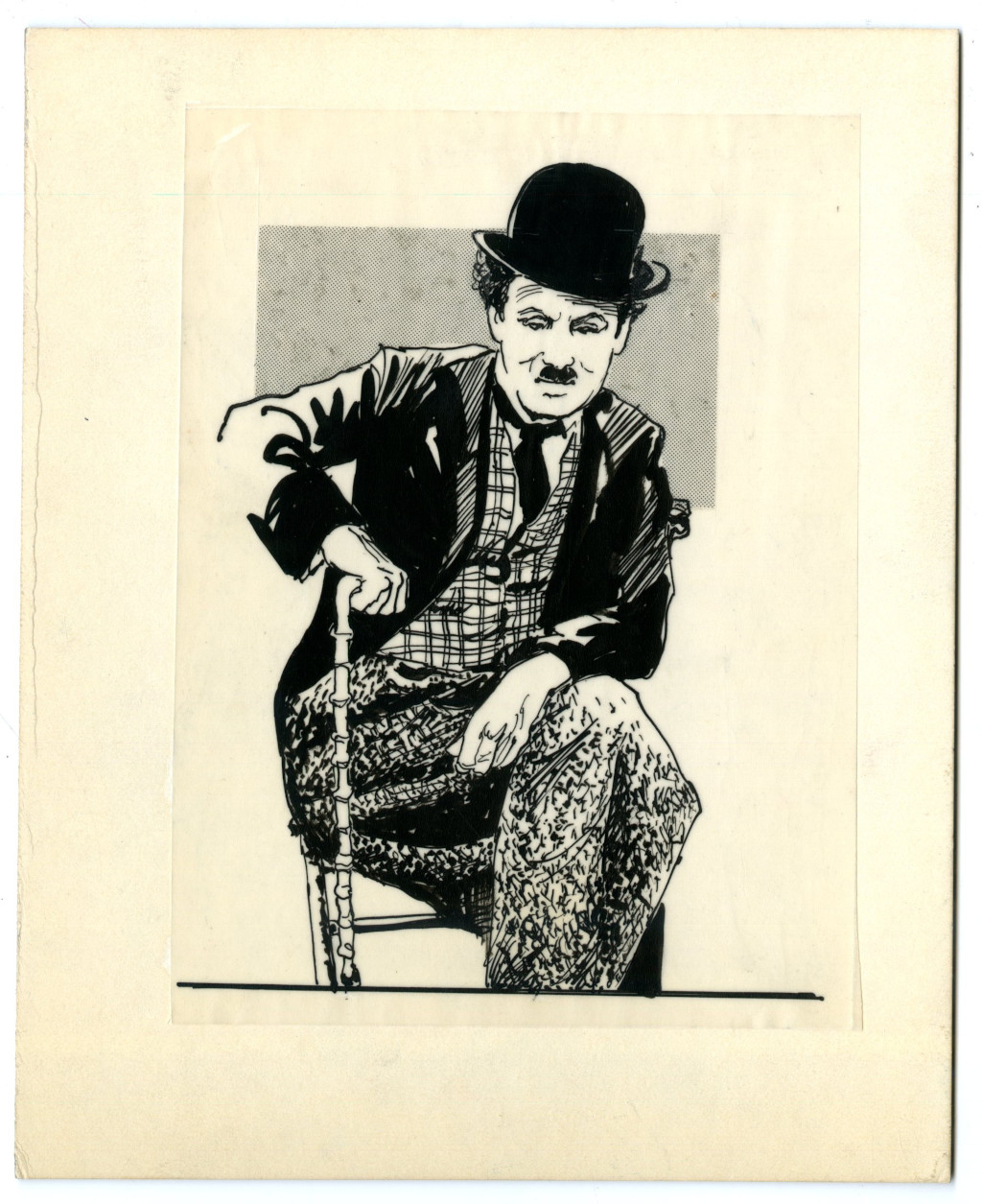 Retrato de Charles Chaplin, actor, director, escritor, productor y compositor británico. Ganador del Óscar de Hollywood. Con casi 90 películas de cine mudo y sonoro, ha llegado a convertirse en la figura más representativa del cine mudo, el cual le ha dado su fama mundial. El personaje entorno al cual construyó gran parte de su carrera cinematográfica, y que le dio fama universal, fue el de vagabundo: un hombre con las maneras refinadas y la dignidad de un caballero.