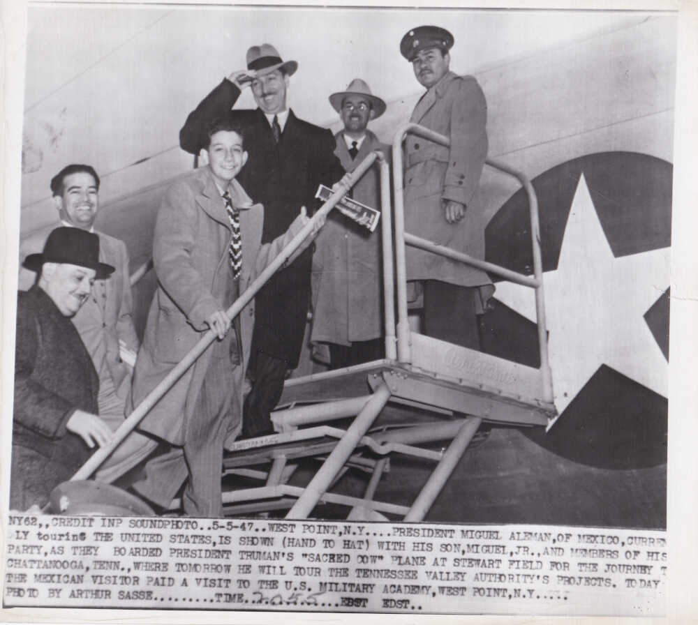 NY2, crédito INP Soundphoto.5-5-47. West Point, Nueva York. El presidente mexicano Miguel Alemán, de gira por Estados Unidos, aparece (llevándose la mano al sombrero) con su hijo, Miguel Jr., y miembros de su comitiva, mientras abordaban el avión "Sacred cow" del presidente Truman en el aeropuerto Stewart Field para su viaje. Mañana visitará los proyectos de la Autoridad del Valle de Tennessee. Hoy, el visitante mexicano visitó la Academia Militar de Estados Unidos en West Point, Nueva York, por Arthur Sasse.