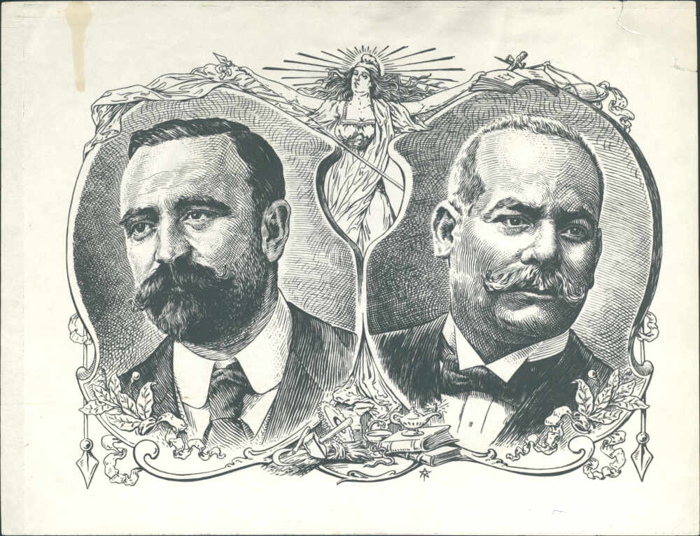 Grabado Álvaro Pruneda del cartel electoral de Francisco I. Madero y Vázquez Gómez.
