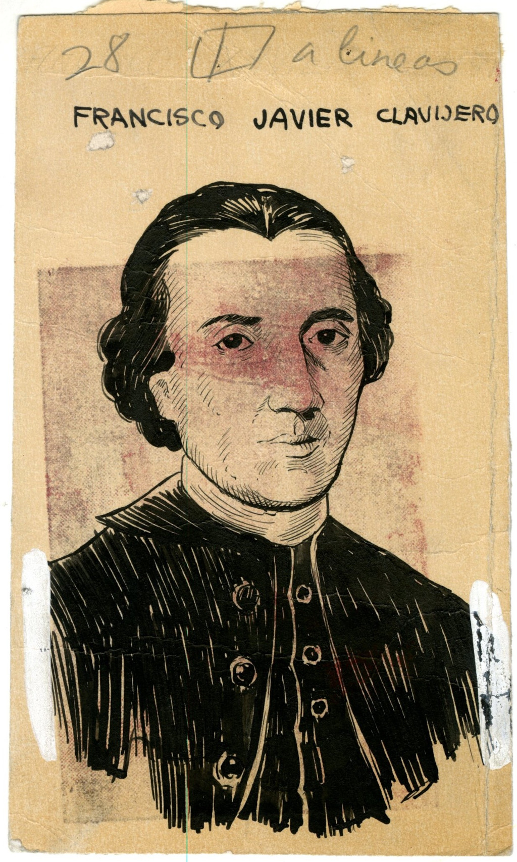 Retrato de Javier Francisco Clavijero. Sacerdote jesuita que vivió en el siglo XVIII. Historiador y religioso novohispano. Su máxima obra fue "Historia Antigua de México", basándose en varios textos para escribirla. Expulsado por ser jesuita de la Nueva España por el decreto de Carlos III.