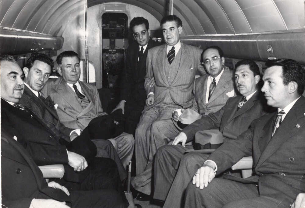 El presidente Miguel Alemán y algunos de sus colaboradores inspeccionando el avión "Stiper DC-3", bimotor Douglas.