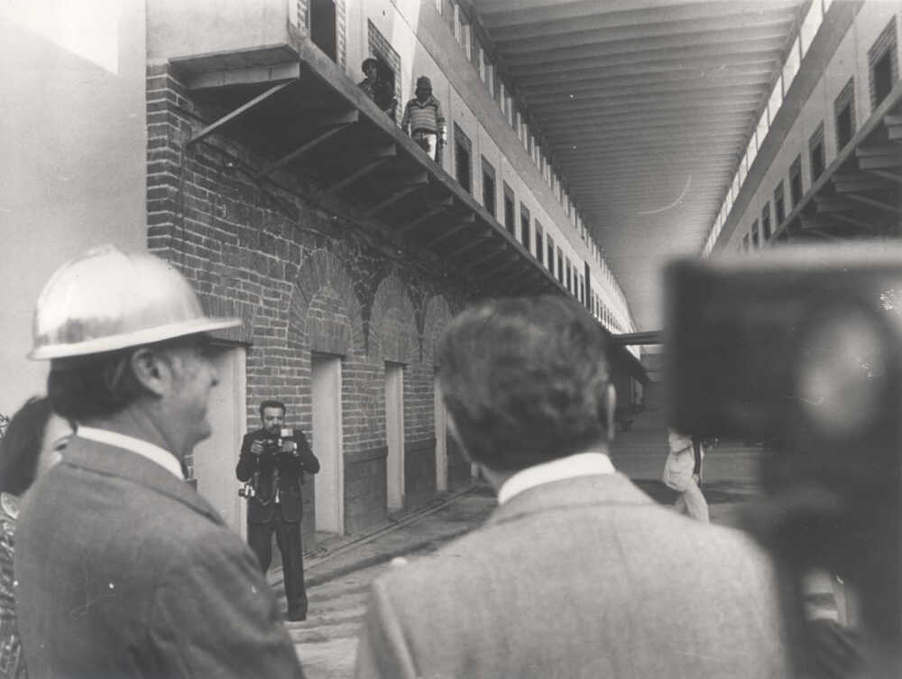 Visita de José López Portillo por lo que serían las galerias del AGN, en Lecumberri.