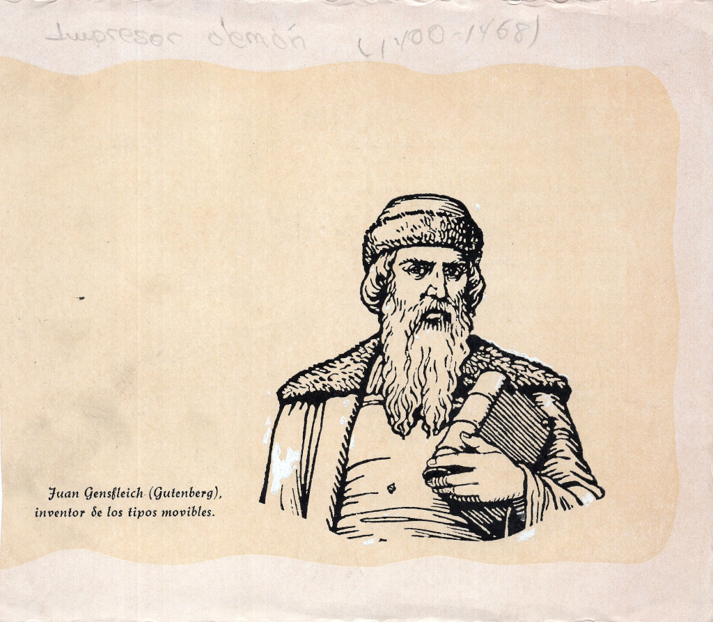 Retrato de Gensfleish Gutenberg, impresor alemán. Inventó la imprenta, permitiendo por primera vez la producción en masa de libros, con la consecuente expansión y dibulgación nunca antes vista de conocimiento. Realmente es el padre y fundador de la era de la información, y sin su invento los avances en las ciencias y el conocimiento que siguieron no hubieran sido posibles.