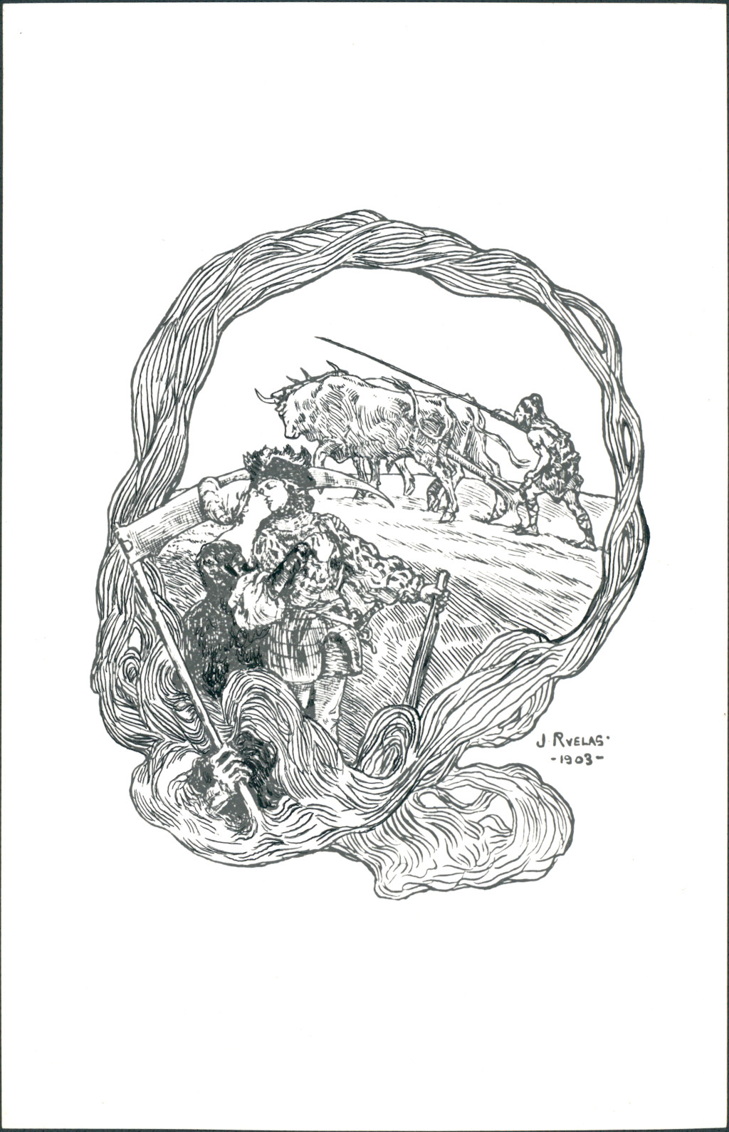 Impresión fotomecánica de la obra del pintor e ilustrador zacatecano Julio Ruelas, "Escena", 1903, tinta sobre papel.