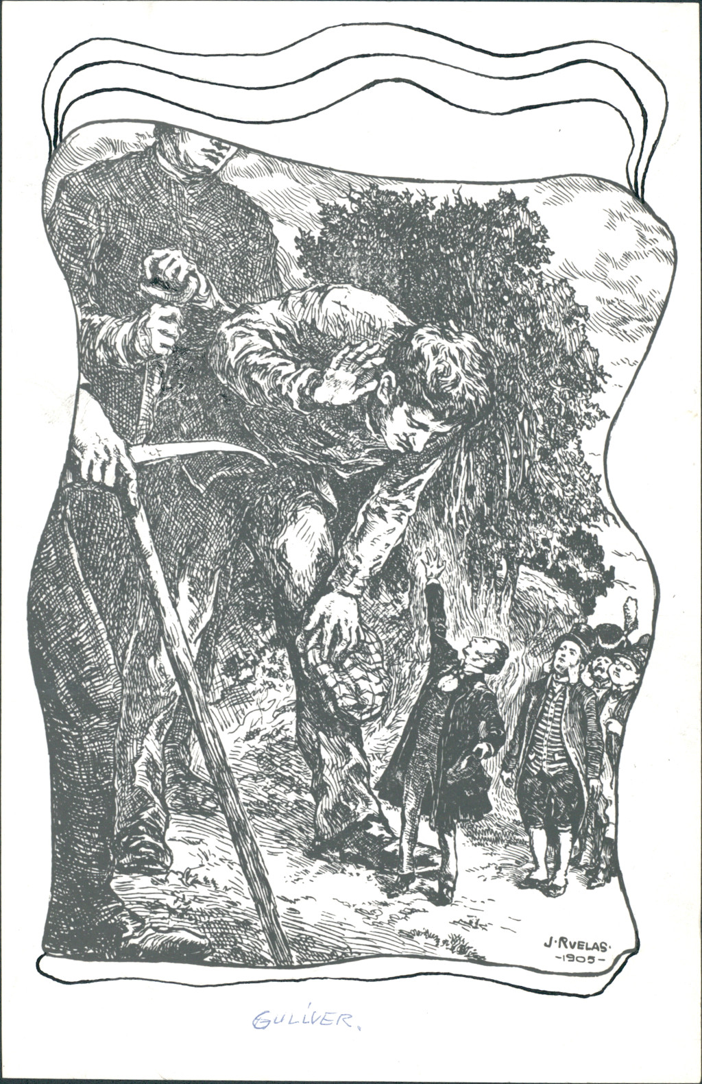 Impresión fotomecánica de la obra del pintor e ilustrador zacatecano Julio Ruelas, "Guliver", 1905, tinta sobre papel.