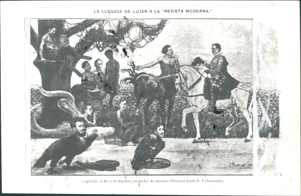 Impresión fotomecánica de la obra del pintor e ilustrador zacatecano Julio Ruelas, "La llegada de Jesús Luján a la Revista Moderna", 1899, óleo sobre tela.