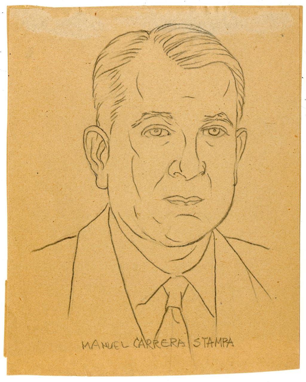Retrato de Manuel Carrera Stampa, abogado e historiador. Colaborador de "El Excélsior" y "El Nacional". Op.: "Misiones Mexicanas en Archivos Europeos"; "Archivalia Mexicana"; "Nuño de Guzmán"; "Doña Marina"; "Planos de la Ciudad de México"; "Los Gremios Mexicanos" (1521-1861), e "Historia del Correo en México".