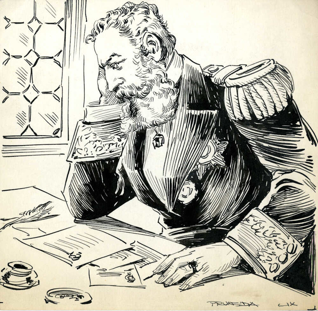 viñeta | emperador | traje | barba | escritorio | hojas | pluma | tintero | ventana