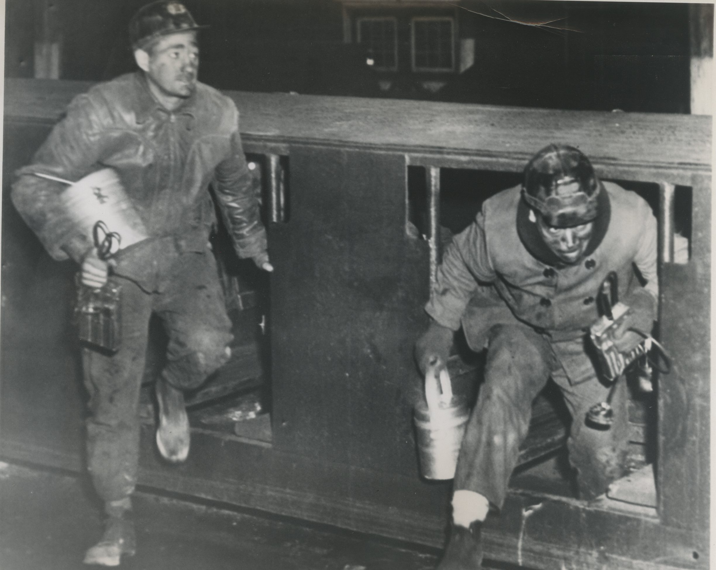 MINERS QUIT THE PITS AS STRIKE STARTS. PITTSBURGH, PA...MEN OF THE LAST WORKING SHIFT QUIT THE CAR WHICH CARRIED THEM TO THE SURFACE AT MONTOUR NINE NO. 10.PITTSBURGH CONSOLIDATED COALCOMPANY, AS THE MINE WORKERS STRIKE GOES INTO EFECT AT MIDNIGHT TONIGHT. 400, 000 DIGGERS OF COAL QUIT THE PITS THROUGHOUT THE COUNTRY. (SM-12-1-49) PHOTOGRAPH BY ED ROMANO. FABCDX.