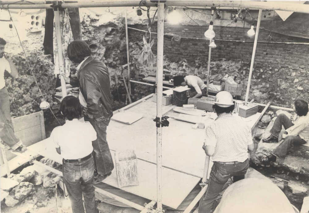 Varios arqueólogos trabajando en el lugar en donde se encuentra el monolito de Coyolxauhqui.